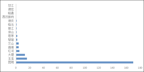 云南省下轄8個地級市、8個自治州,合計16個地級行政區劃單元,省會昆明市。本次調查的云南省環保企業數量的地區分布如圖6。
