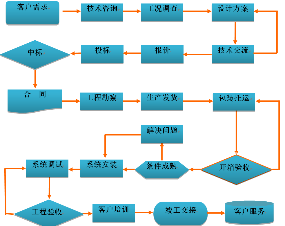 我公司經過多年的經驗總結,形成了一套完整合理的客戶服務流程體系,服務流程包括銷售服務、系統設計、采購、生產、檢驗、工程實施、投運、維護等各個環節。公司對相關的服務流程持續的完善和優化,使系統服務的質量管理更加標準化、程序化、規范化,為系統服務工作奠定了扎實的基礎。