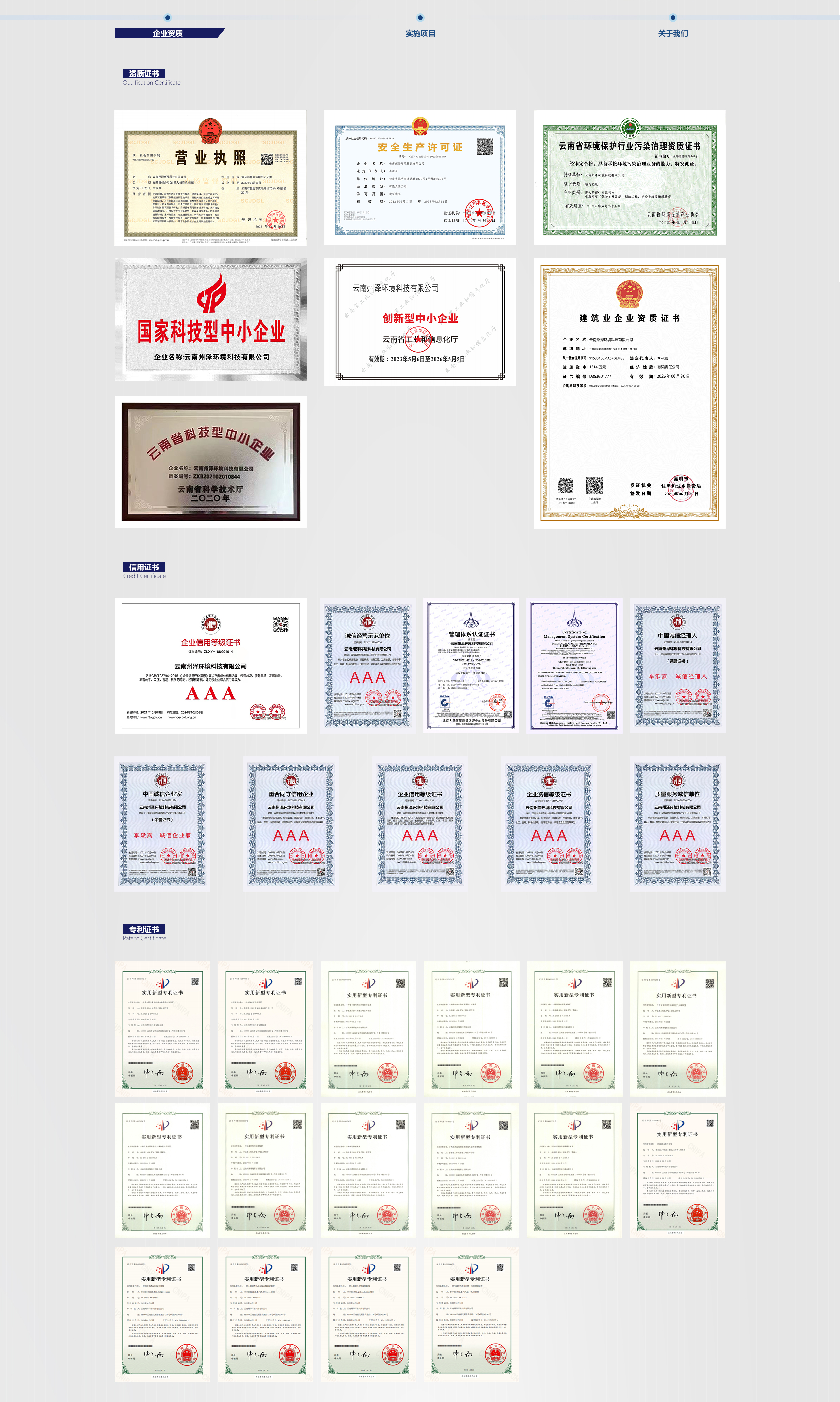 綜合服務(wù)項(xiàng)目業(yè)績覆蓋生活垃圾及固廢處理處置、流域水環(huán)境綜合治理、農(nóng)村環(huán)境綜合治理、工業(yè)污染場地、農(nóng)用耕地土壤修復(fù)和礦山生態(tài)修復(fù)等領(lǐng)域。具有“環(huán)保工程專業(yè)承包三級”資質(zhì),獲得質(zhì)量管理體系、AAA企業(yè)信用等級、國家及云南省科技型中小企業(yè)等證書,并取得16項(xiàng)專利。