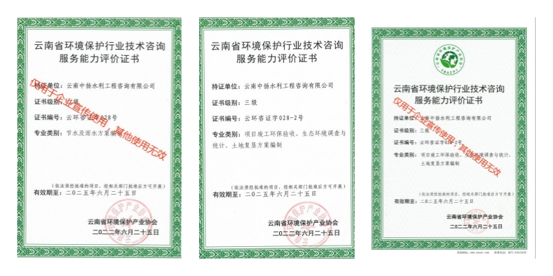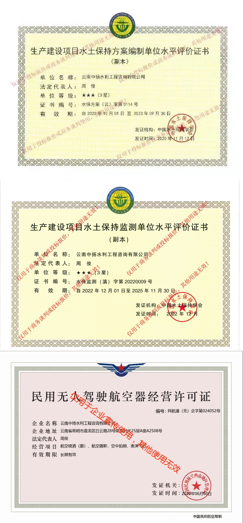云南中揚水利工程咨詢有限公司成立于2011年,注冊資金100萬元整。公司從事的主要業務為生產建設項目水土保持咨詢設計(水保方案編制、水保監測、技術評估及咨詢)、水土保持規劃、水利工程設計(農田水利、河道)、可行性研究報告編制、土地復墾等。公司已取得水土保持方案編制、水土保持監測、工程咨詢備案、環境污染治理、環境保護行業技術咨詢服務能力評價證書、民用無人駕駛航空器經營許可證等資格證書,是云南省水土保持學會和云南省環境保護協會會員。